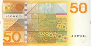 Mi último billete, el de los 250 florines con el faro en él, en la parte superior hay tres nombres, mis nombres secretos! Corresponden a tres damas: mi nieta, Ana, mi novia con la que estaba viviendo, Ria, y una amiga secreta. Cuando estos estaban en circulación recibí una carta del director del banco y me dijo alguien, un idiota o un coleccionista, que había analizado el billete con una lupa le había escrito al Banco preguntando cuál era el significado de los nombres. El presidente del banco le respondió que no lo sabía! Yo estaba tan exultante de lo que había hecho, después de todo ese tiempo. Por supuesto, son también un muy buen dispositivo contra la copia.